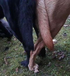 Twerk har været på besøg hos Femmer 10 og 12 Marts. Om fredagen før første parring lå Progesteronen på 3,16 ng og sammenlignet med hendes tidligere målinger som har været meget stabile, formodede vi ægløsning lørdag aften/nat. Så vi gav det en chance søndag aften, med det i baghovedet det evt kunne være lidt tidligt. Twerk er meget nem at læse hvis hun ikke er klar. Femmer har ikke parret før, så Twerk guidede ham fint. De legede lidt og Femmer begyndte meget meget høftligt, at blive mere pågående. Efter en halv time med et par lige ved og næsten forsøg, fik de en kort pause. Da vi kom ud igen, havde Femmer helt tydeligt dannet sig et billede, af hvad det og hvordan det gik ud på. Efter lidt leg hang de sammen. Twerk blev dog lidt urolig ved låsning og pep lidt, det er ukendt og jeg havde mistanke til, vi måske nok var en kende tidligt på den. Hun slappede dog hurtigt af og så stod begge hunde super fint. Vi nappede en måling mandag morgen, som viste 10,89 ng og at hun havde haft ægløsning, men bekræftigede min mistanke til en kende tidlig 1 parring. Sæden lever dog fint i tæven op til 5-6 døgn så ingen skade sket.
